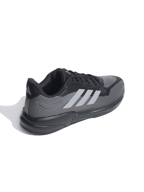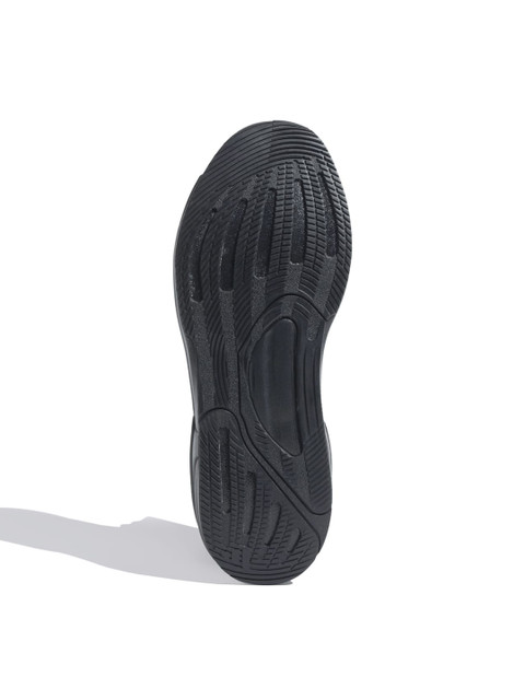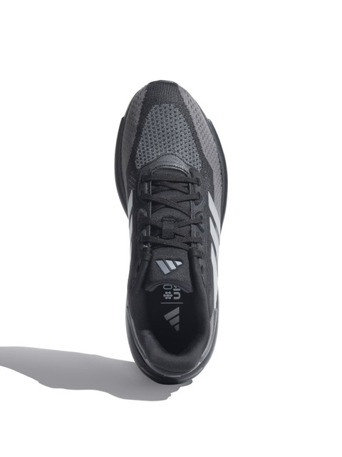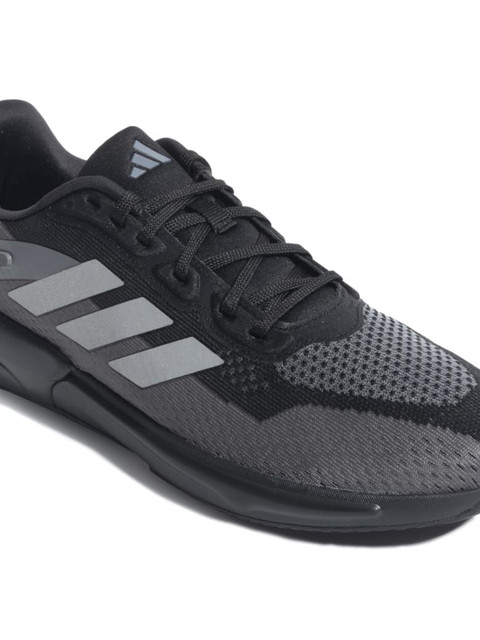 A pair of black textured round toe regular sports shoes with regular styling has a lace-up closure