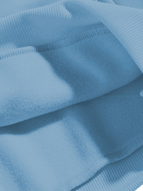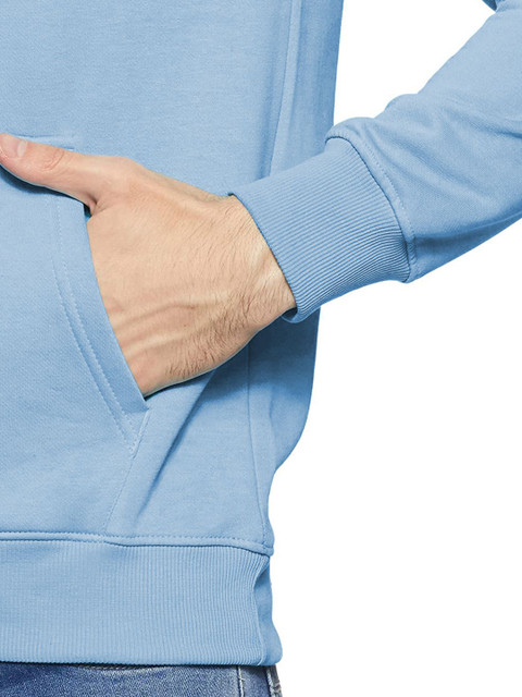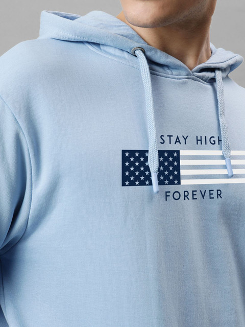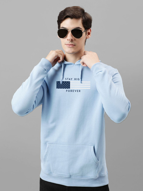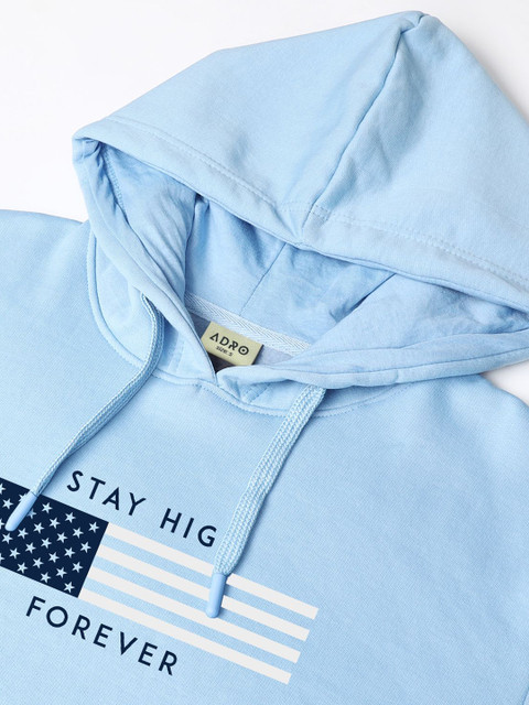Blue printed sweatshirt has a hooded, 2 kangaroo pocket pockets, long sleeves, closure, ribbed hem