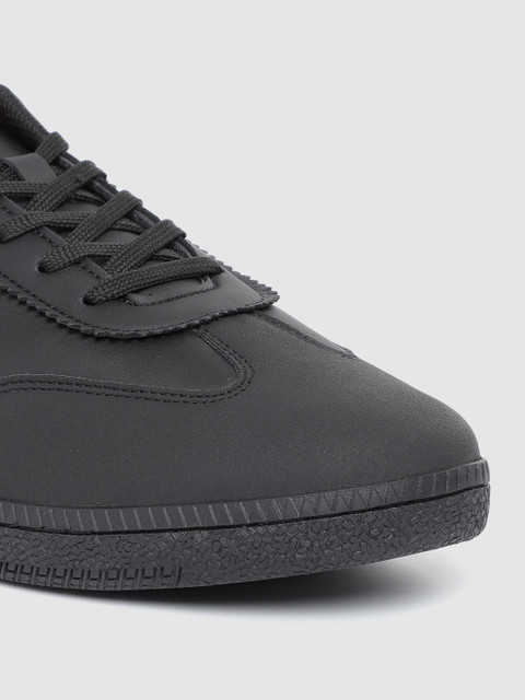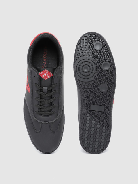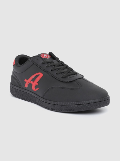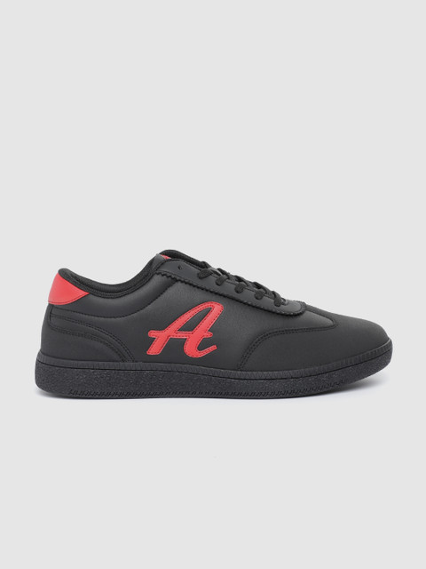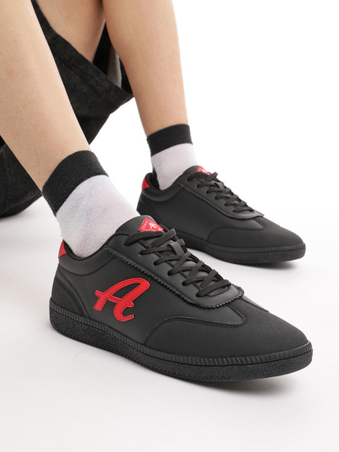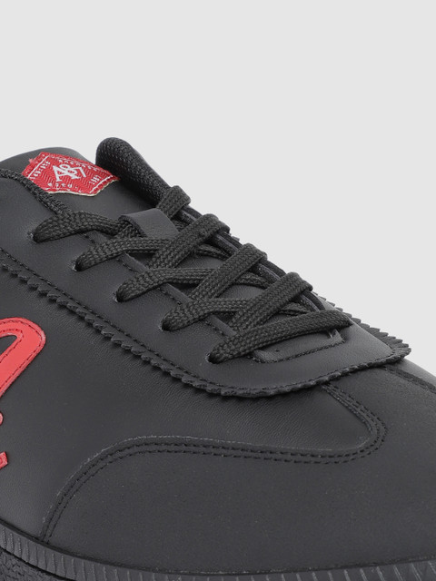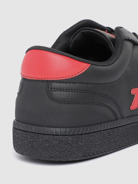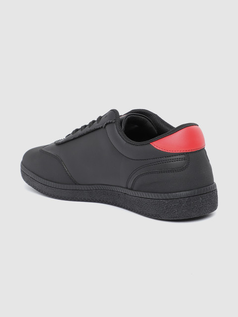 A pair of round toe black and red sneakers with brand logo applique detail, has regular styling,
