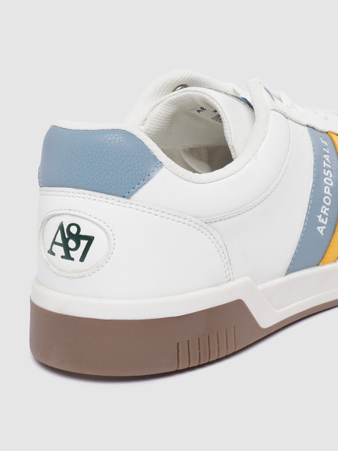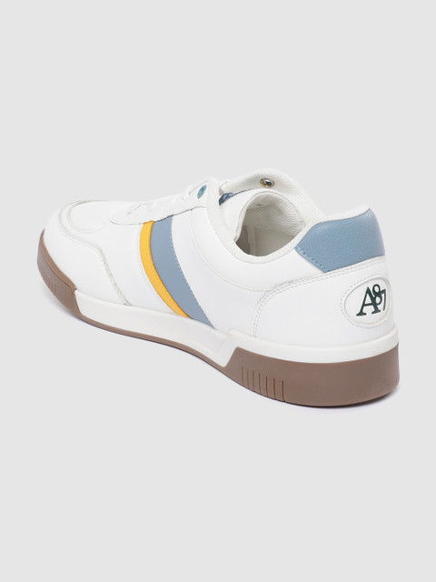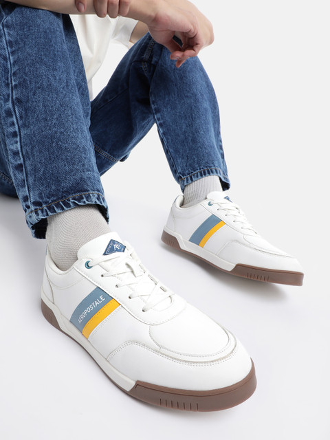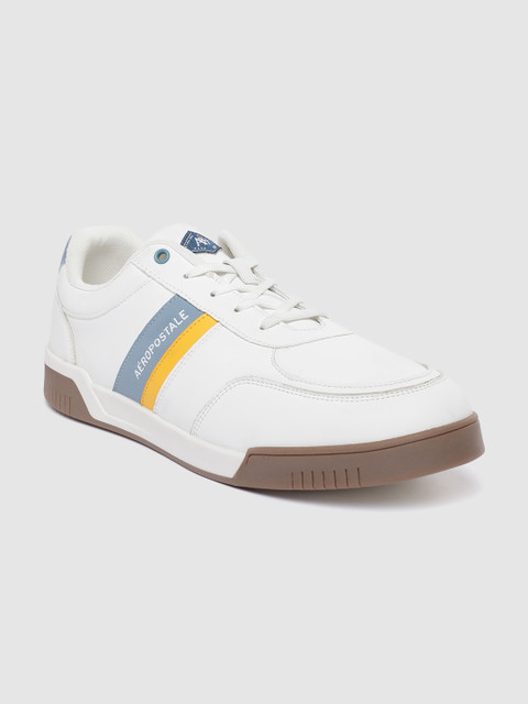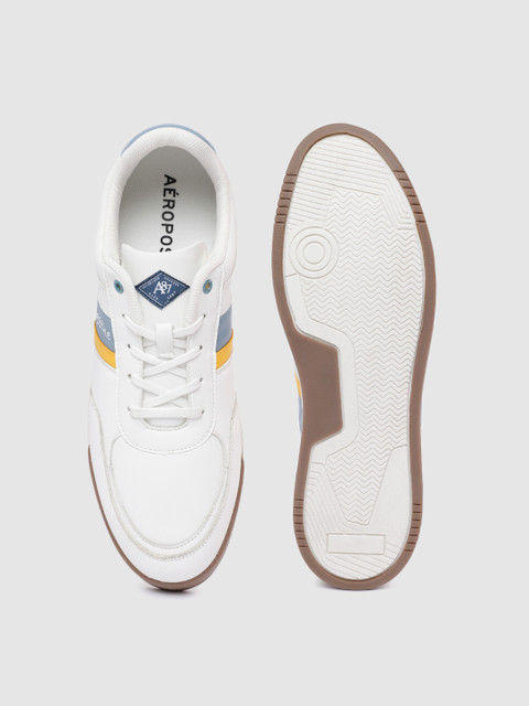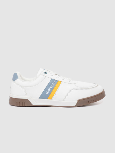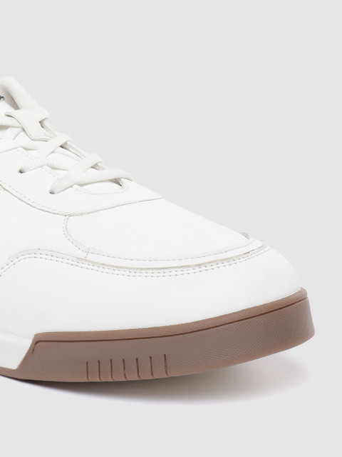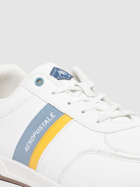 A pair of round toe white sneakers ,has regular styling,