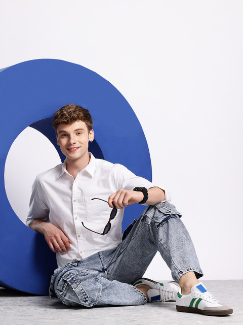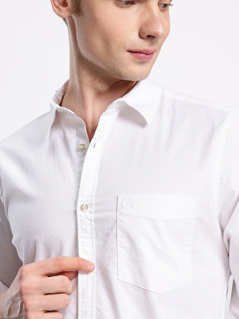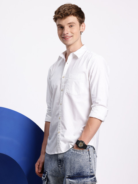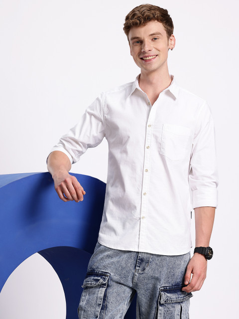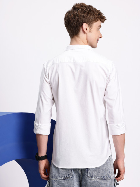 White solid opaque Casual shirt ,has a spread collar, button placket, 1 patch pocket, long regular sleeves, curved hem