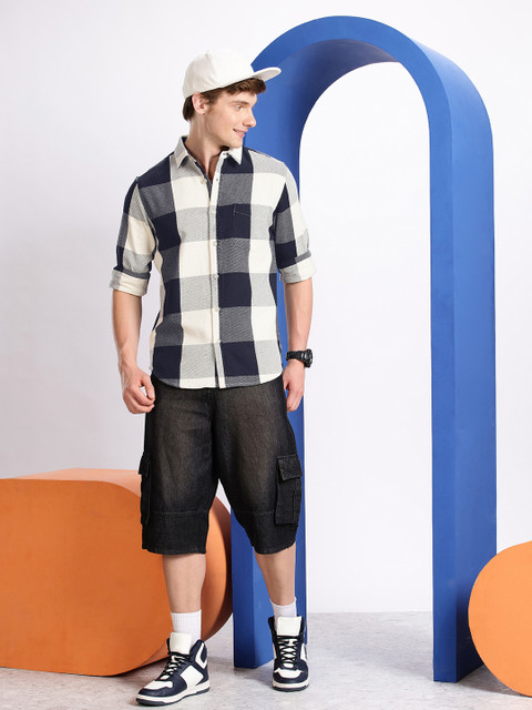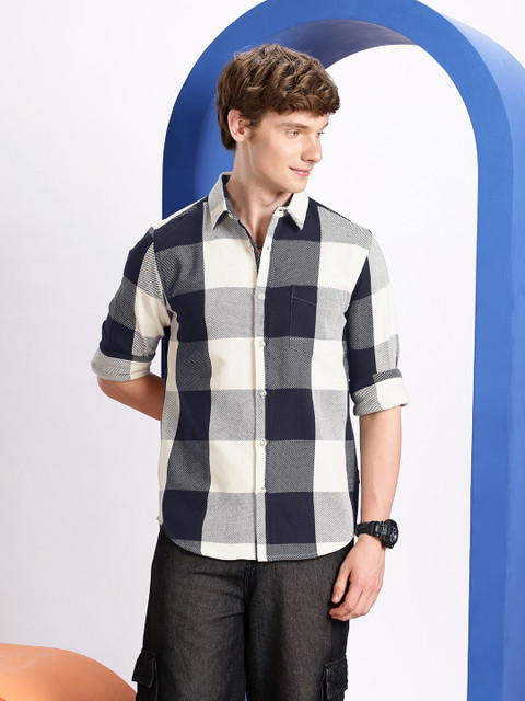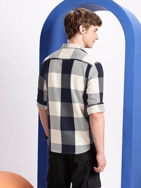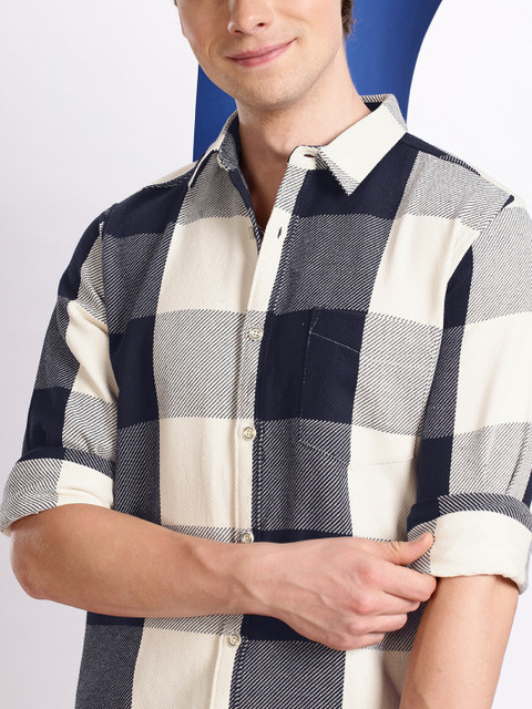 Navy blue buffalo checked opaque Casual shirt ,has a spread collar, button placket, 1 patch pocket, long regular sleeves, curved hem