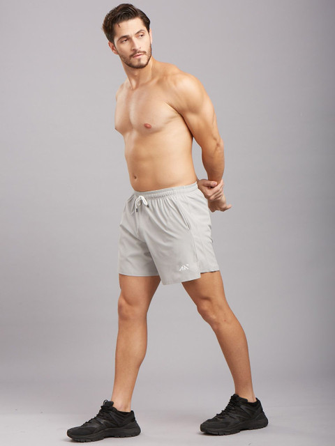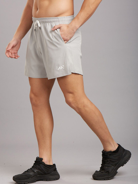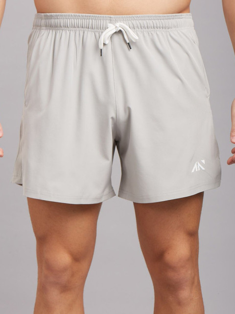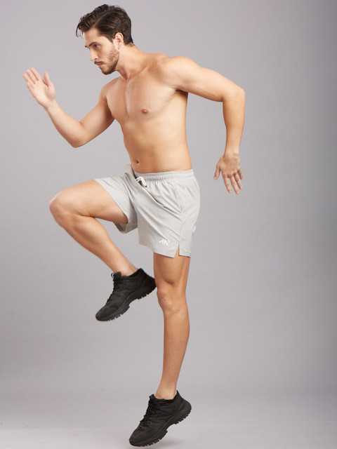 Grey solid mid-rise training or gym sports shorts, has 2 pockets, drawstring closure engineered with dri-fit technology