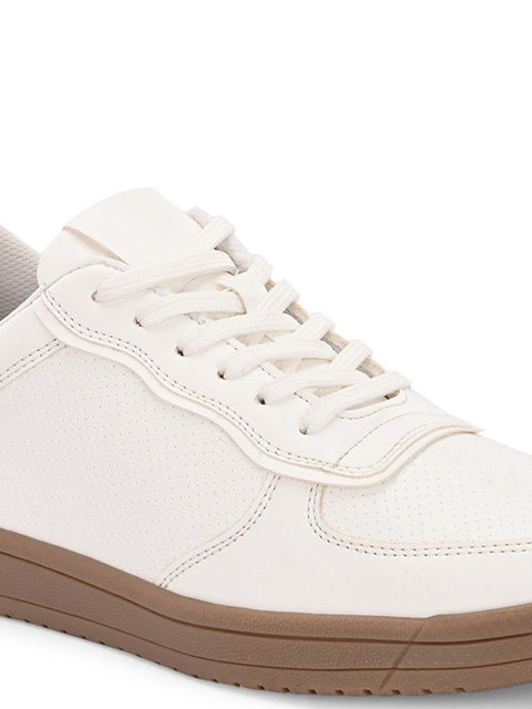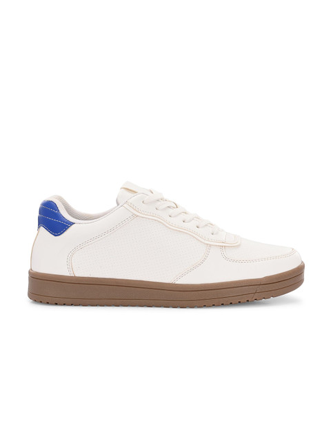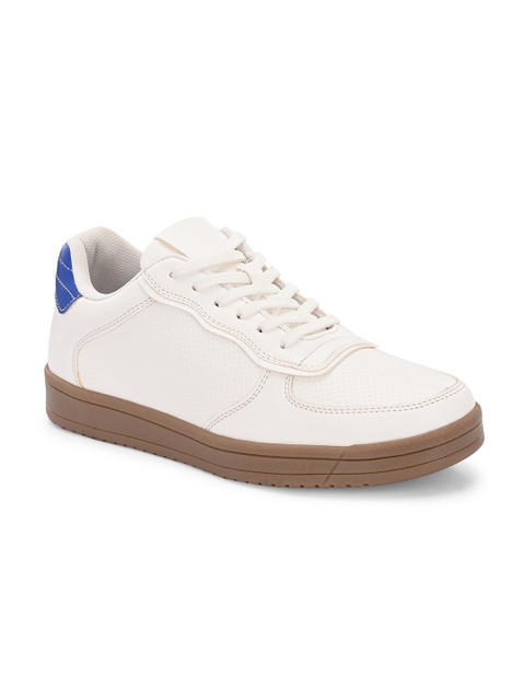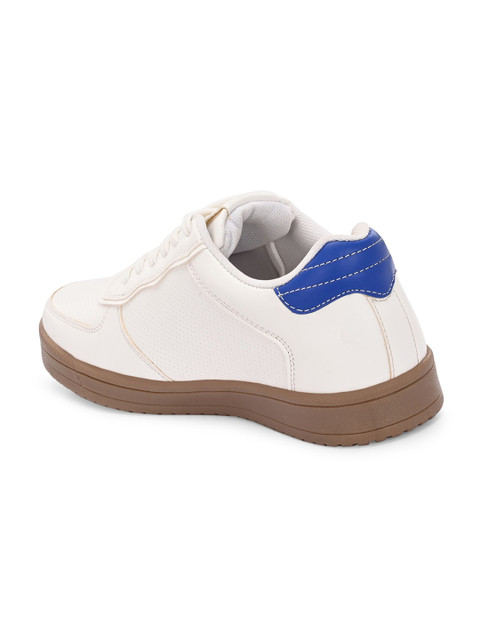 A pair of round toe white sneakers ,has regular styling,