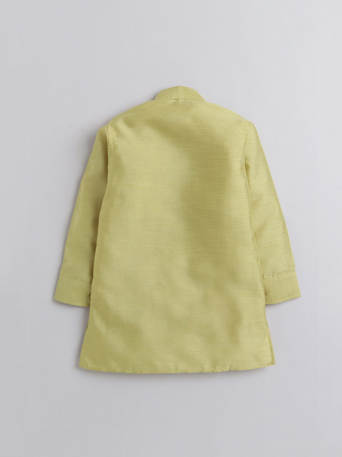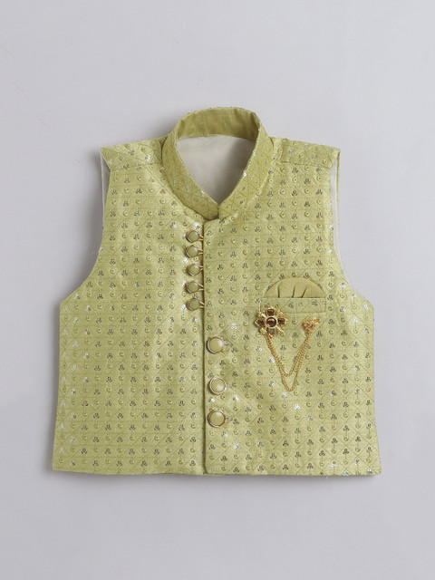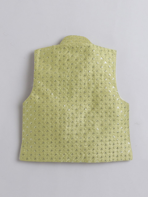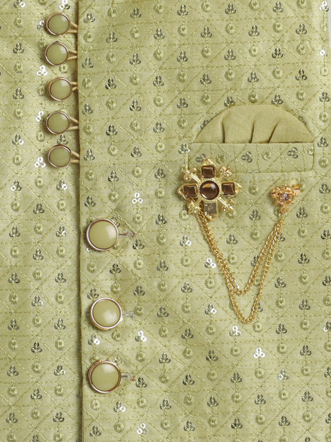 Green embroidered indo western sherwani jacket, has a mandarin collar, stylised button placket, sleeveless, one welt pocket