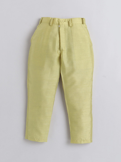 A pair of Green solid trousers, has a partially elasticated waistband with belt loops, button closure, zip fly and two pockets