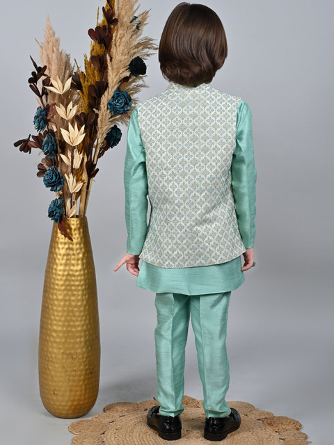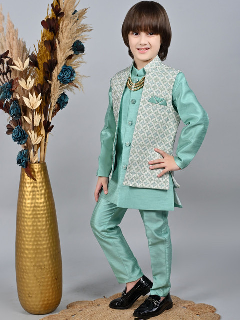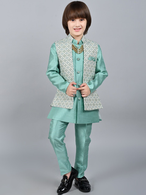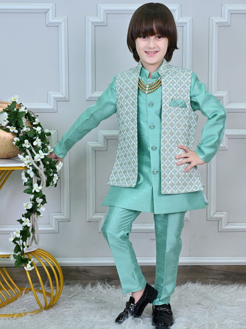 Turquoise Blue solid sherwani, has a mandarin collar with button closures and long sleeves