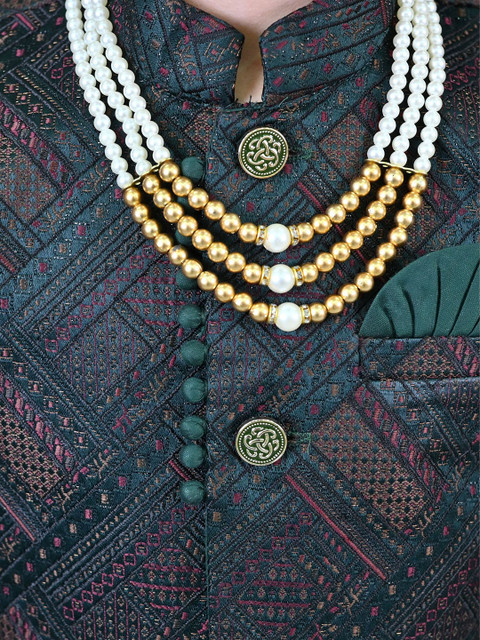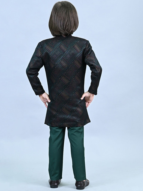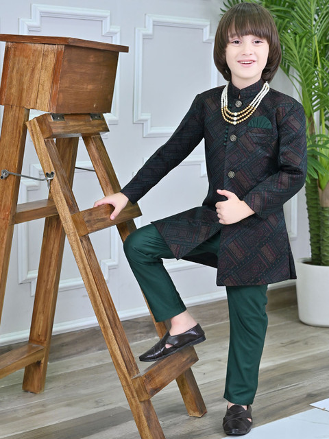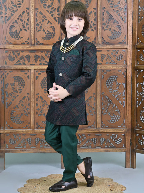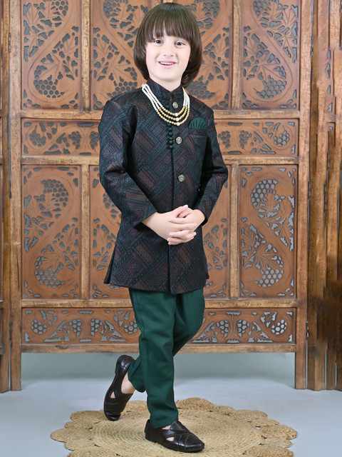 Green and red self-design sherwani, has a mandarin collar, stylised front with button closures and long sleeves