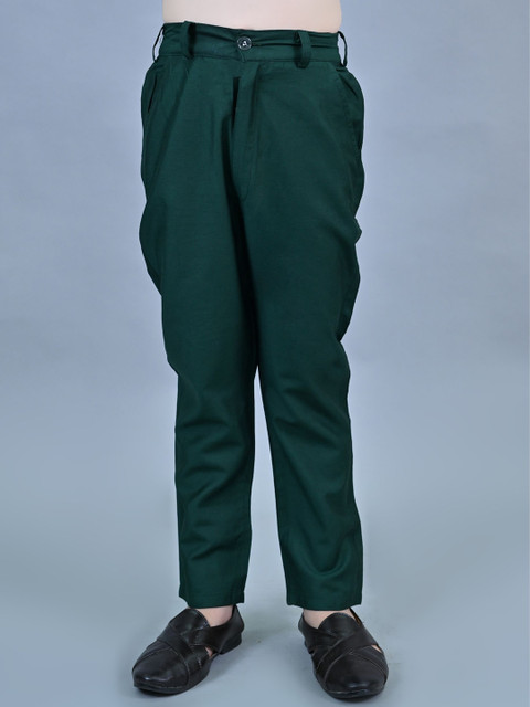 Green solid mid-rise trousers have a full-length with button closure, zip fly, partially elasticated waistband with belt loops, and two pockets