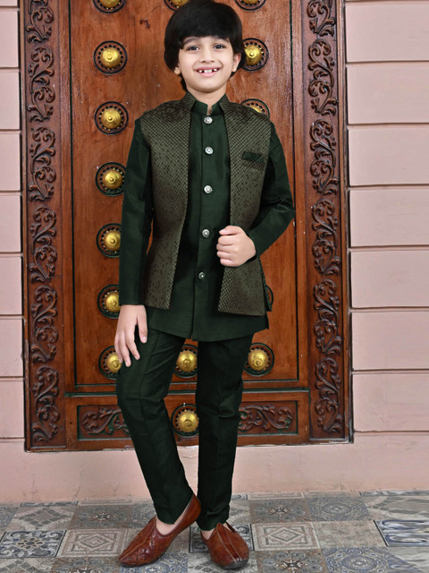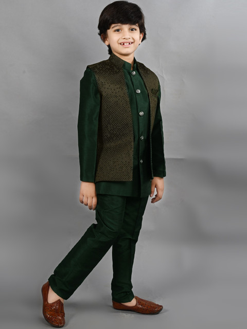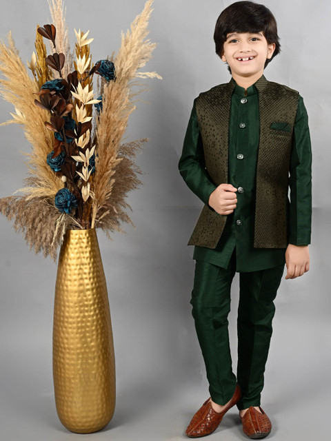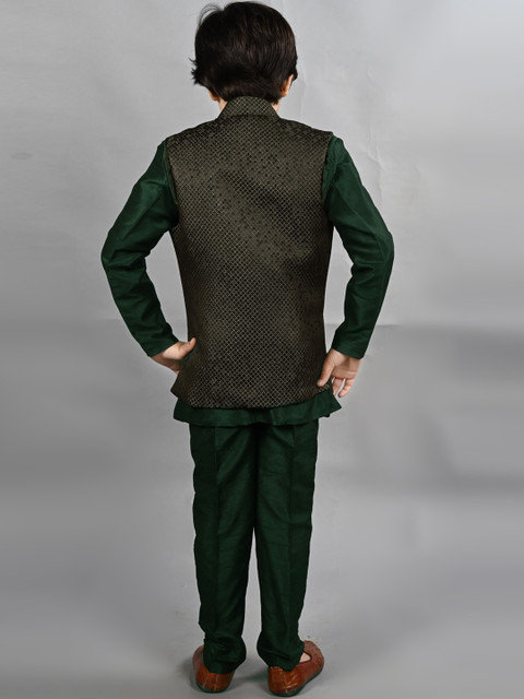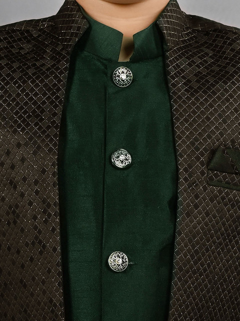 Green self-design waistcoat, has a mandarin collar, open front and sleeveless