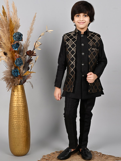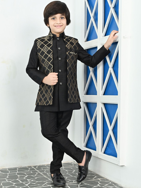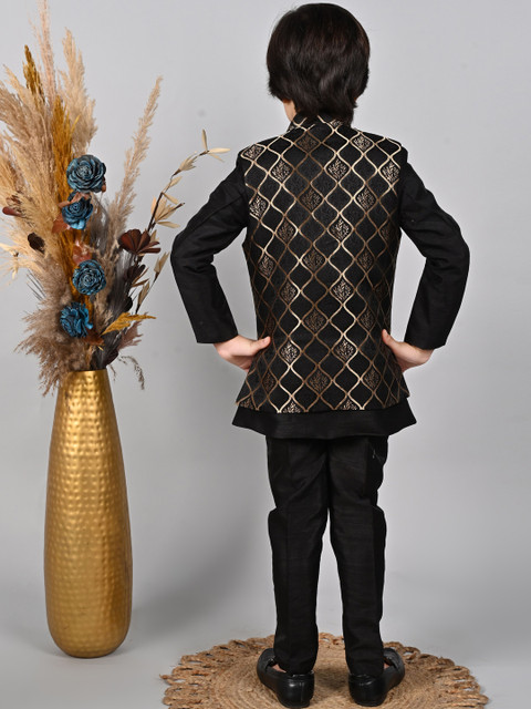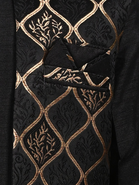 black printed sherwani, has a mandarin collar, stylised wrap-over front with button closures, long sleeves, one welt pocket and multiple slits
