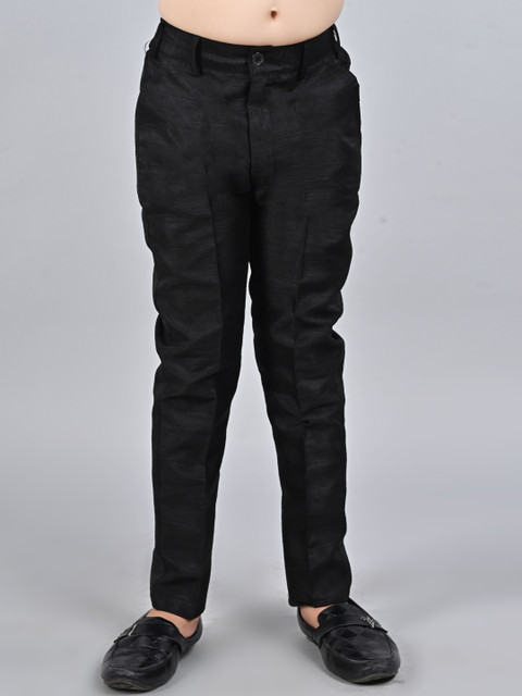 Black solid trousers, has a partially elasticated waistband with belt loops, button closure, zip fly and two pockets