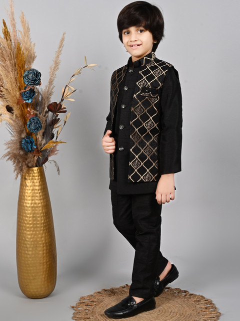 black solid kurta, has a mandarin collar, a short button placket, long sleeves and side slits