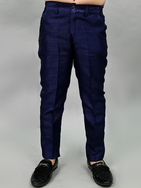 Navy blue solid trousers, has a partially elasticated waistband with belt loops, button closure, zip fly and two pockets