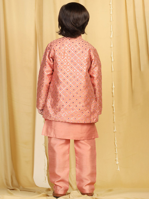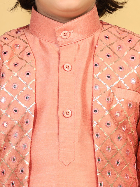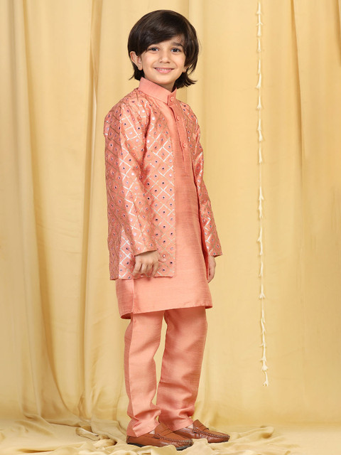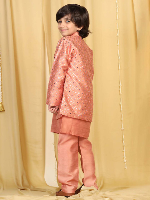 Peach-Coloured woven-design sherwani set, has a mandarin collar, full-front button placket, long sleeves, a straight hem, and multiple slits