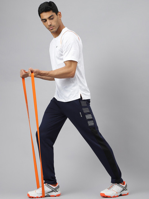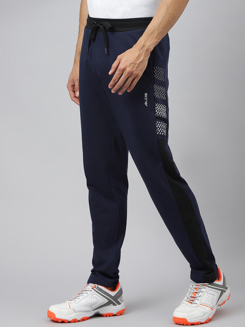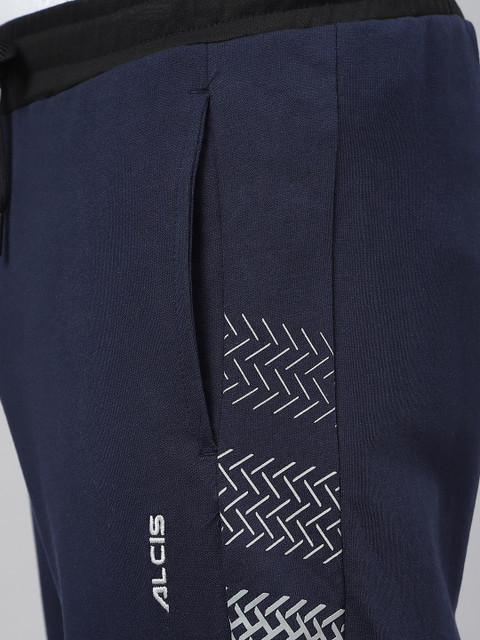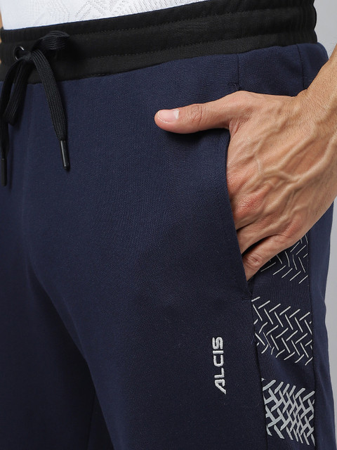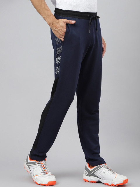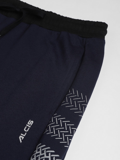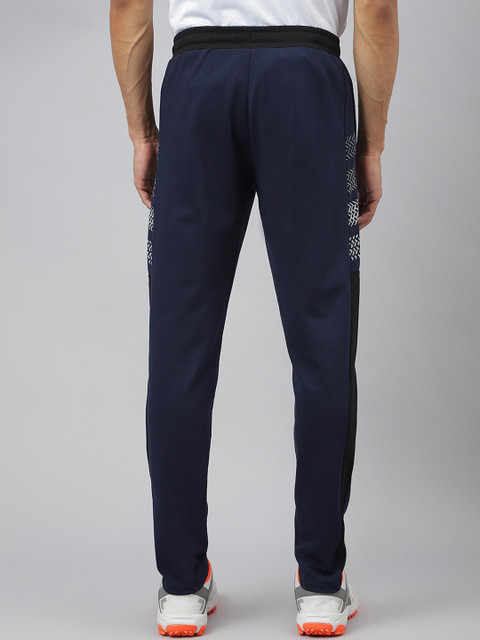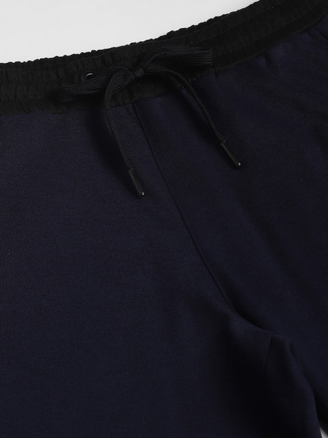 Navy blue solid with side printed detail slim -fit mid-rise track pants, has an elasticated waistband with drawstring closure and two pockets