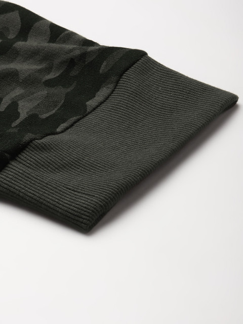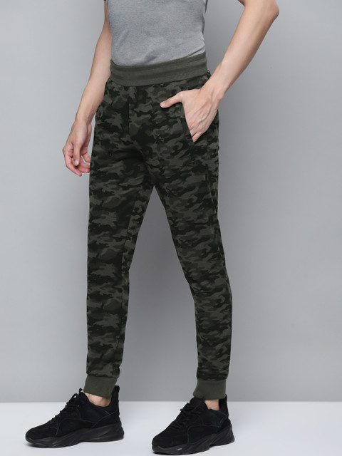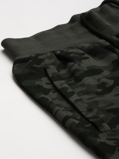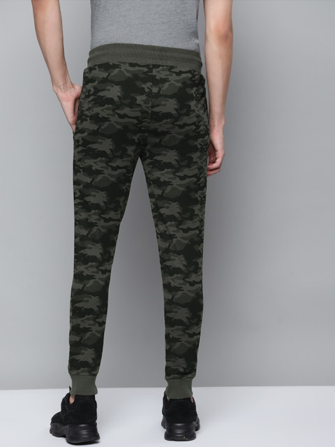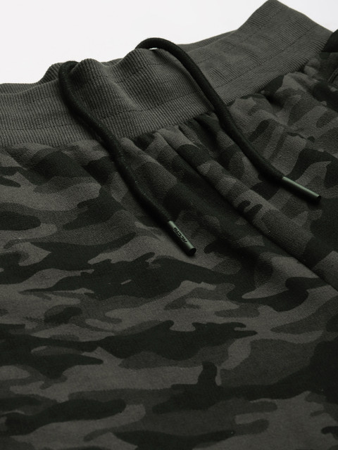 A pair of Olive green camouflage printed joggers, has an elasticated waistband, with a drawstring closure and two pockets.