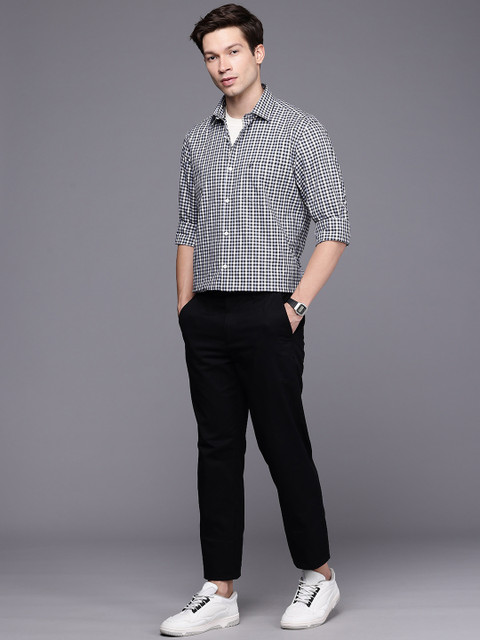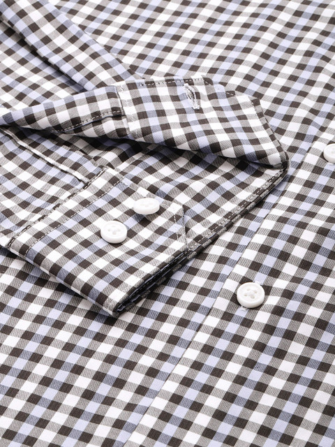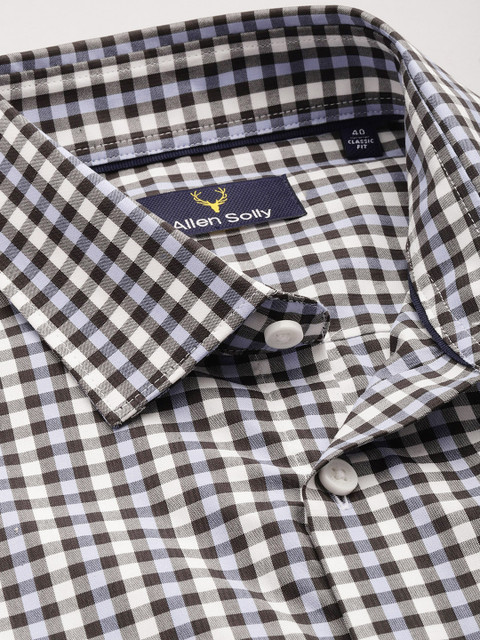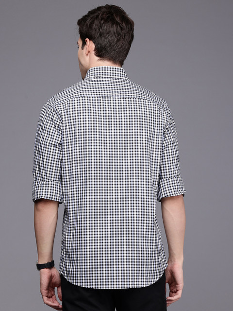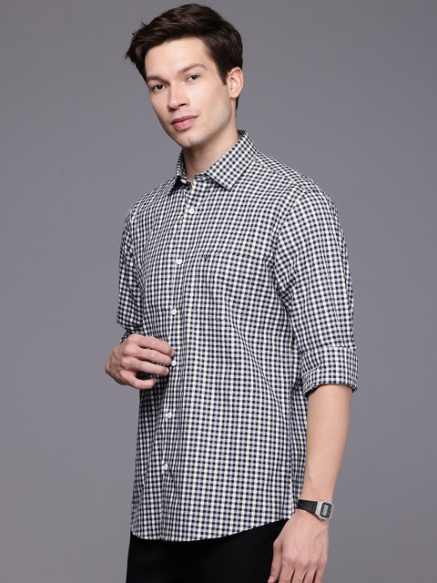 Multicoloured checked opaque casual shirt, has a cutaway collar, button placket, 1 patch pocket, long regular sleeves, curved hem