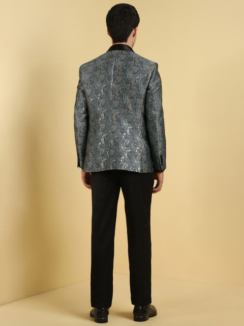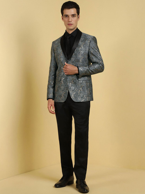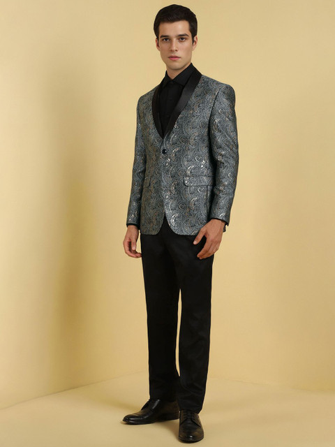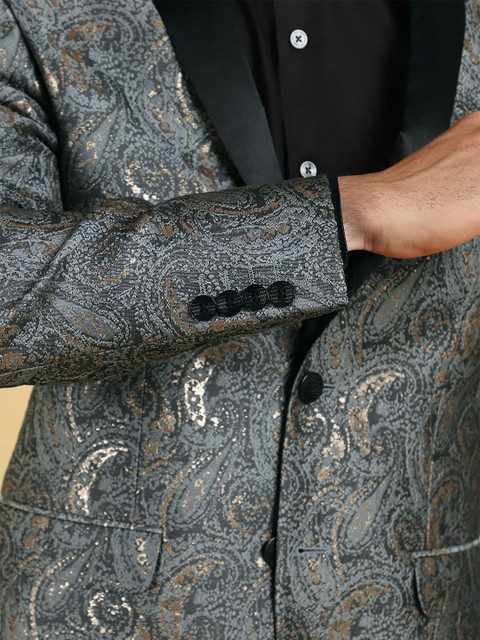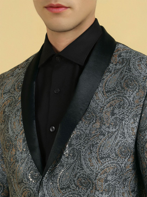 Grey printed slim-fit single-breasted blazer, has a shawl collar with button closures, long sleeves and three pockets