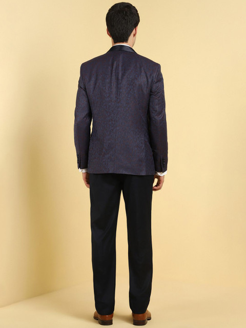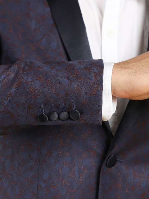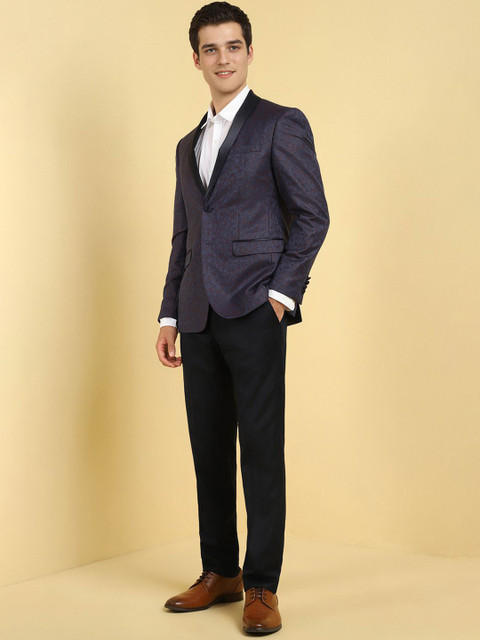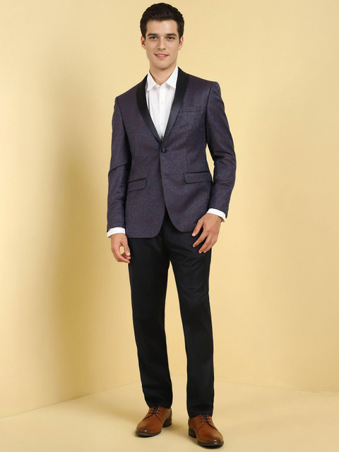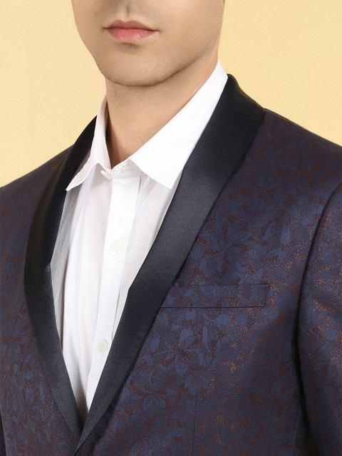 Blue printed slim-fit single-breasted blazer, has a shawl collar with button closures, long sleeves and three pockets