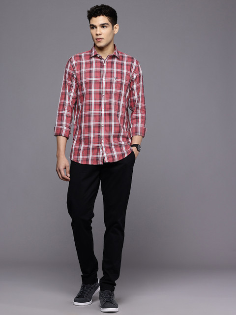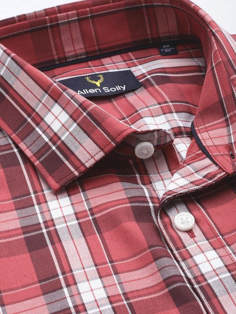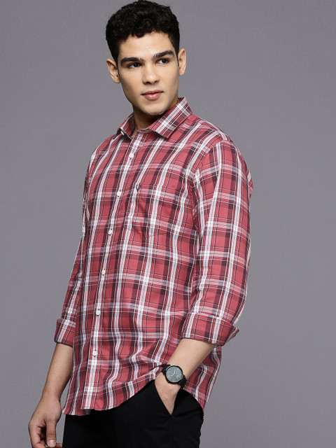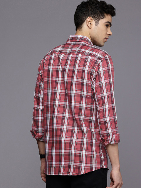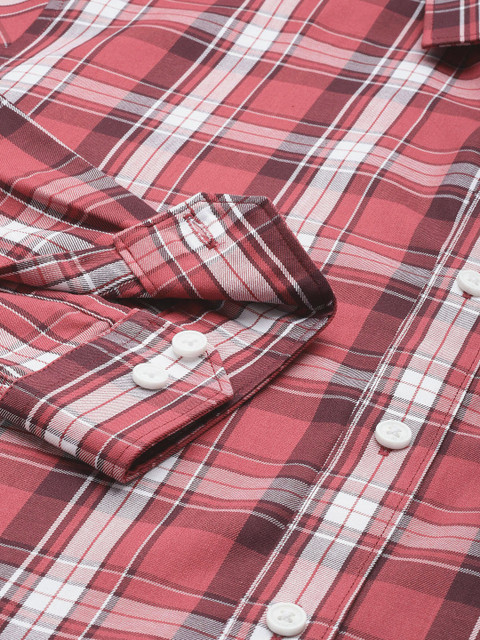 Coral red other checks opaque casual shirt, has a cutaway collar, button placket, 1 patch pocket, long regular sleeves, curved hem
