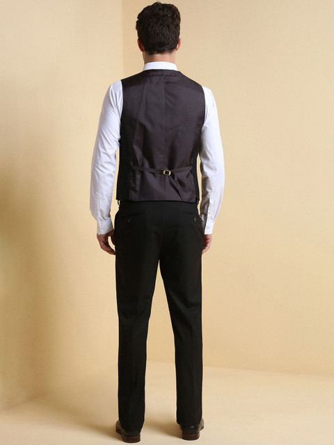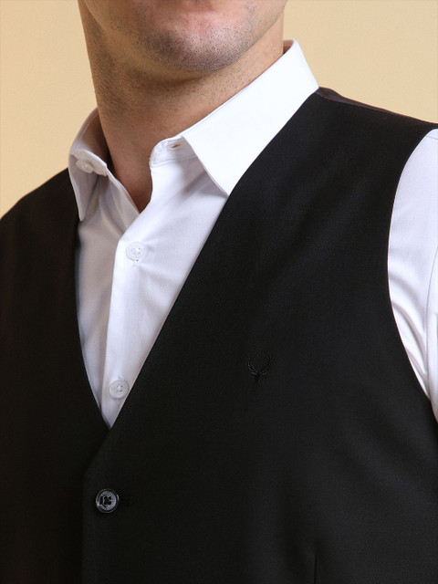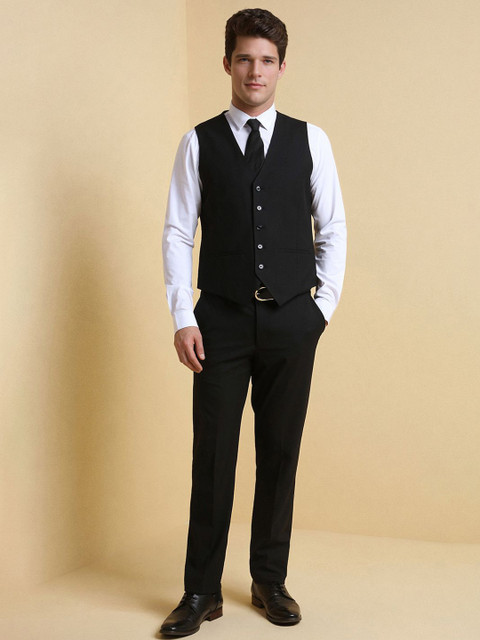 Black solid single-breasted slim-fit waistcoat, has a V-neck, button closures on the front, and two pockets