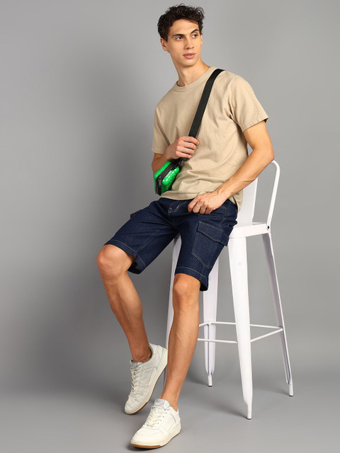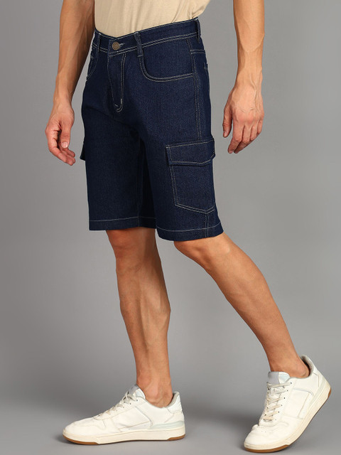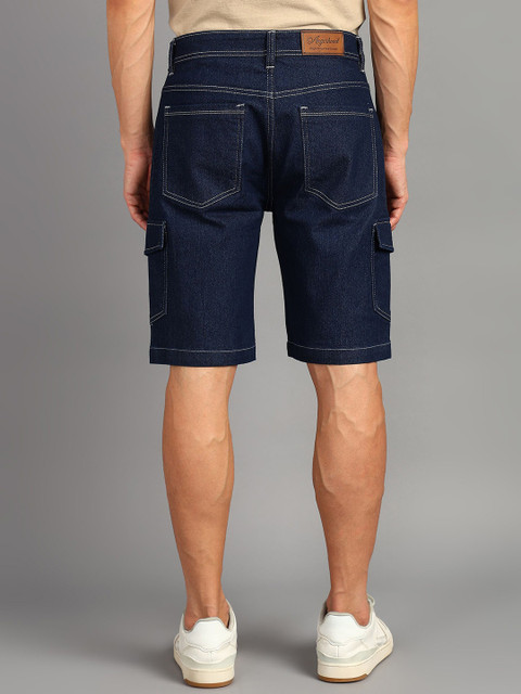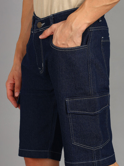 Blue solid mid-rise denim shorts, has 4 pockets, button closure