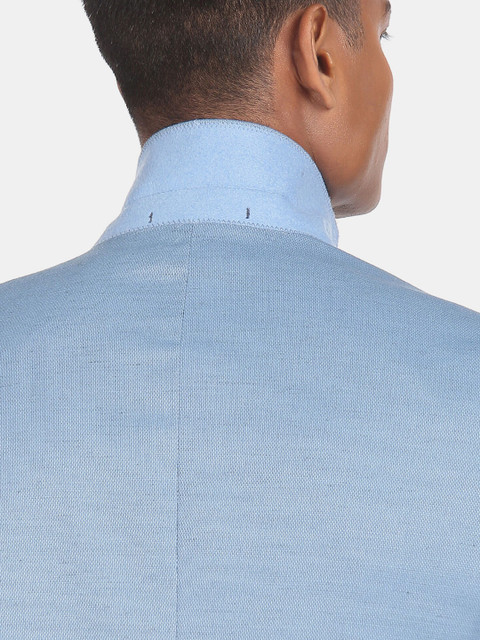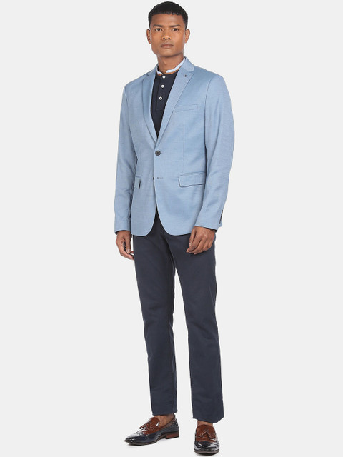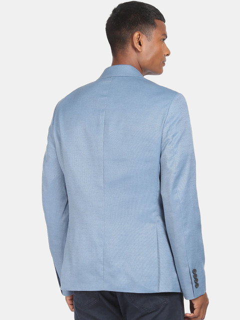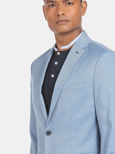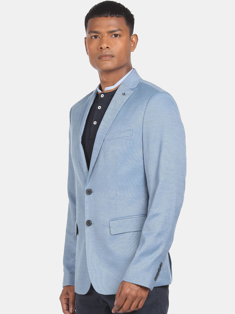 - Blue formal blazer, has a notched lapel, lightly padded shoulders