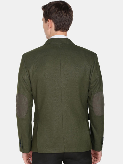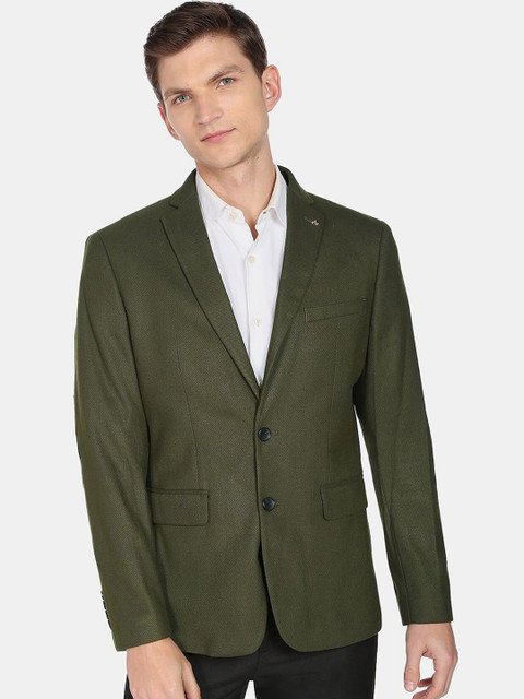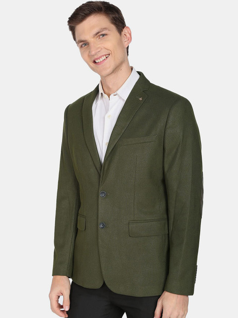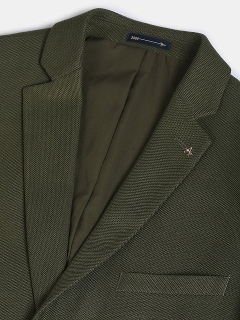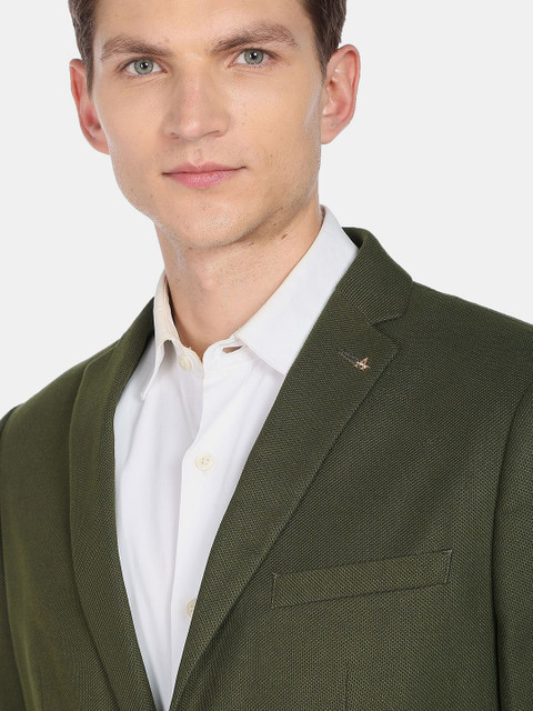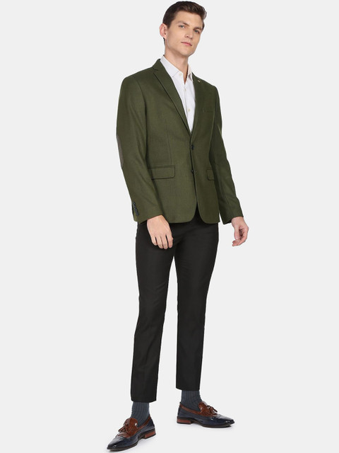 Green solid slim-fit formal blazer, has a notched lapel, long sleeves, single-breasted with double button closure, two flap pockets, one welt pocket and a double-vented back hem