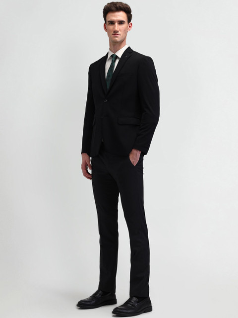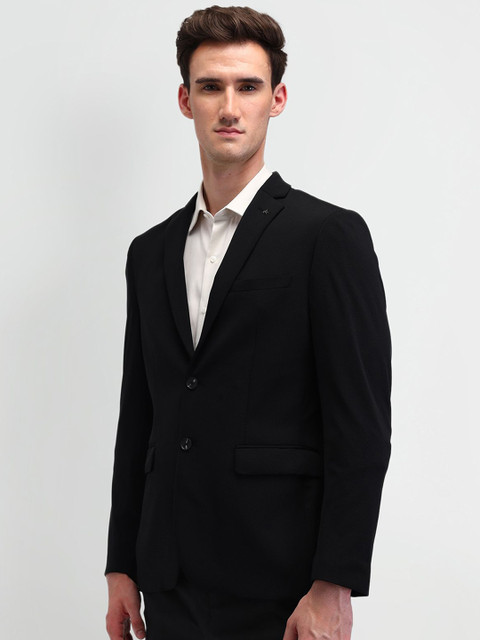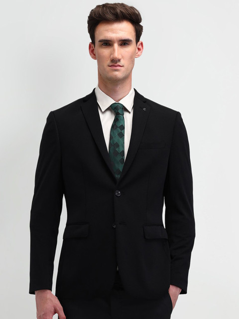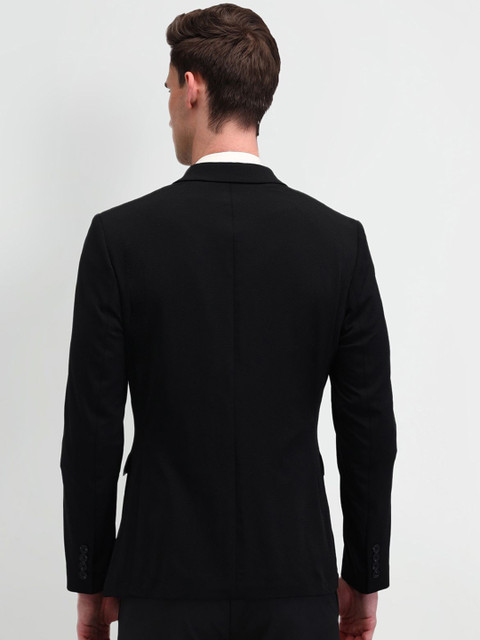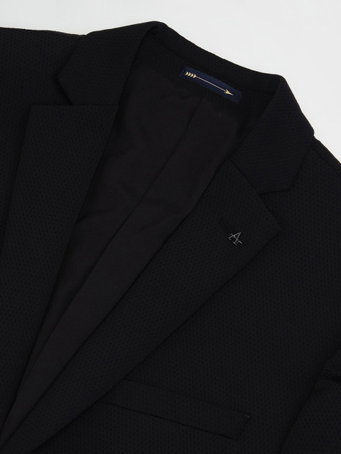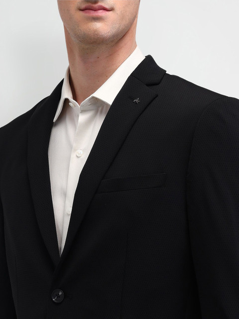 Black self designed slim-fit formal blazers, has a notched lapel collar, long sleeves, single-breasted with button closure, three flap pockets and single vented back hem
