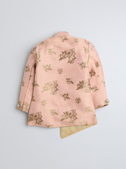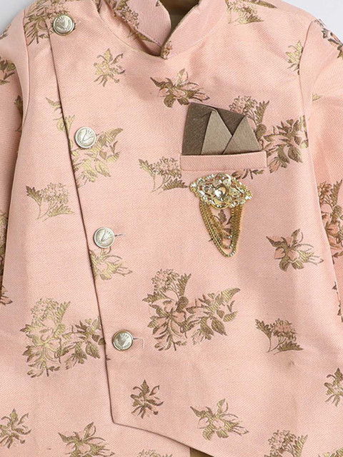Brown printed sherwani, has a mandarin collar, stylised wrap-over front with button closures, long sleeves, one welt pocket and multiple slits