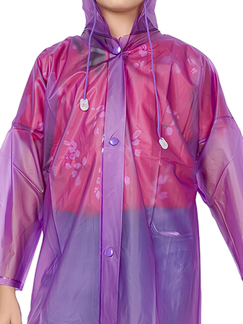 Purple solid rain jacket, has a self-attached hood that comes with a drawstring toggle and cord lock stopper with the front closure using snap buttons and a placket covering the zipper with velcro closure and long sleeves