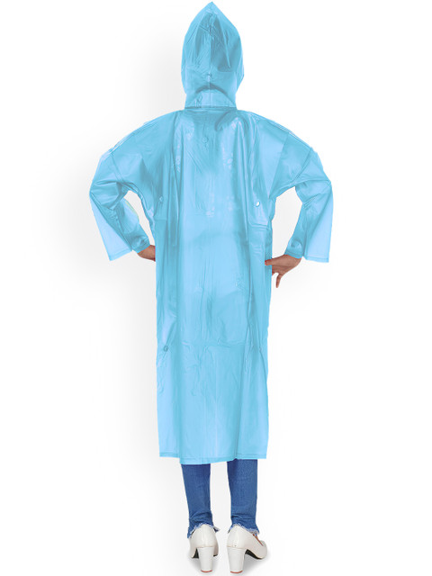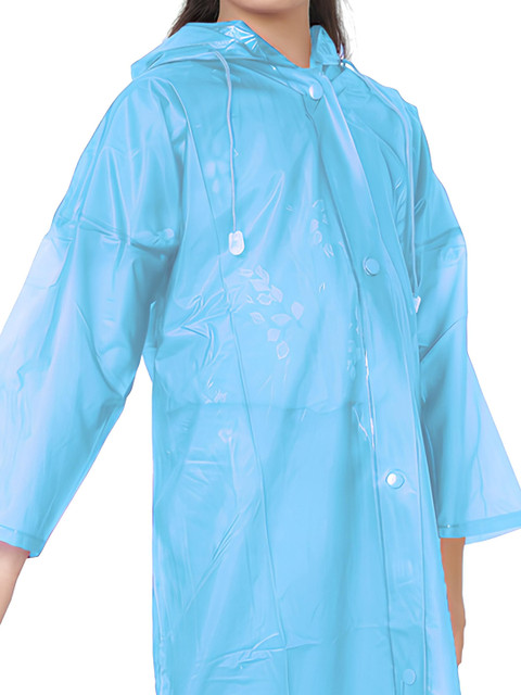 Blue solid rain jacket, has a self-attached hood that comes with a drawstring toggle and cord lock stopper with the front closure using snap buttons and a placket covering the zipper with velcro closure and long sleeves