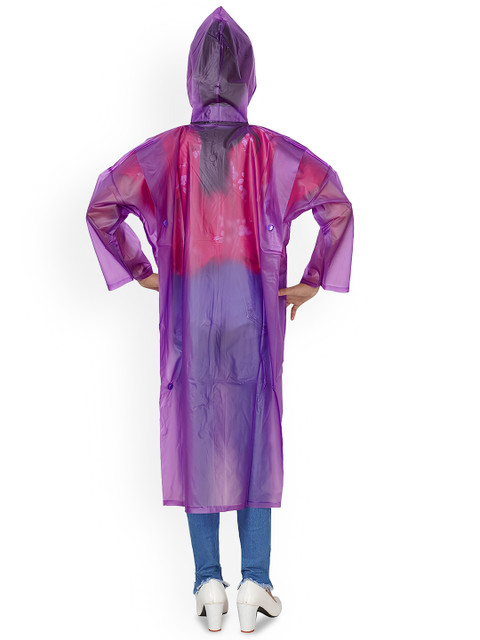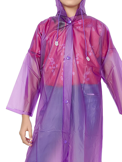 Purple solid rain jacket, has a self-attached hood that comes with a drawstring toggle and cord lock stopper with the front closure using snap buttons and a placket covering the zipper with velcro closure and long sleeves