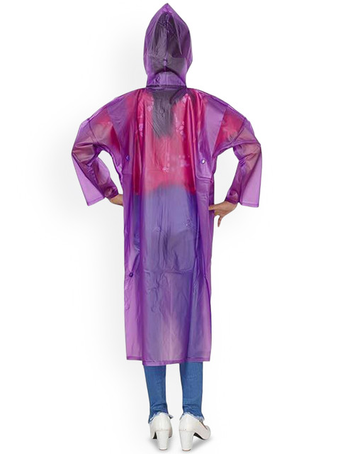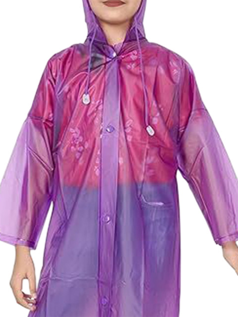 Purple solid regular-fit hooded rain jacket, has an attached hood with drawcord toggle, seam-sealed and a full front Button closure