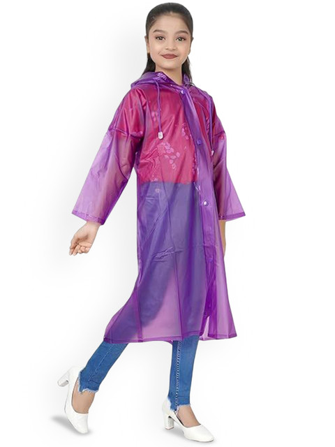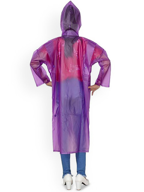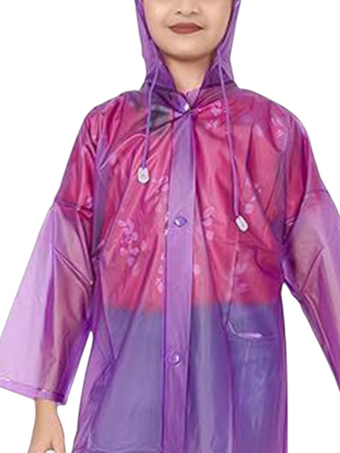 Purple solid rain coat, has an attached hood, seam sealed with adjustable hems, button closure