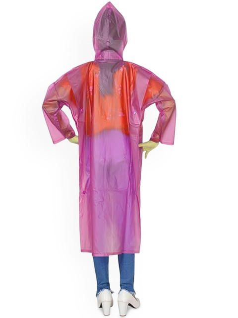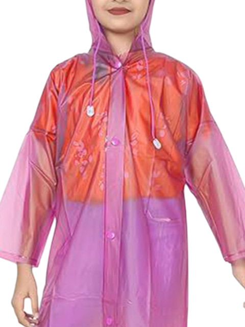 Pink solid rain coat, has an attached hood, seam sealed with adjustable hems, button closure
