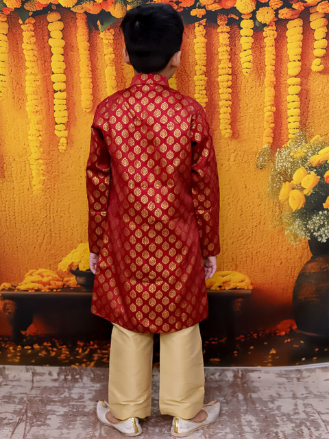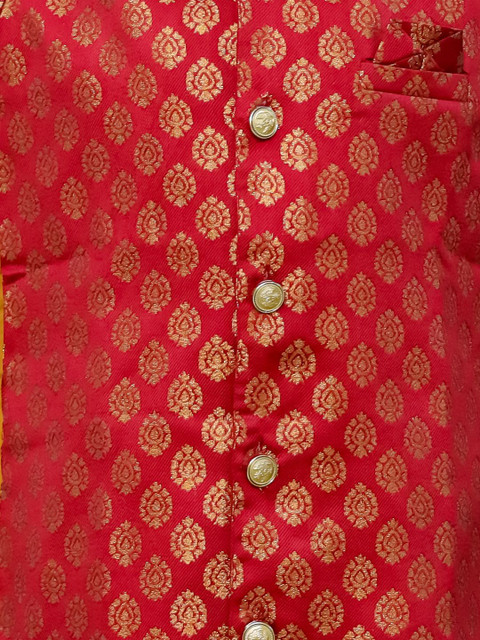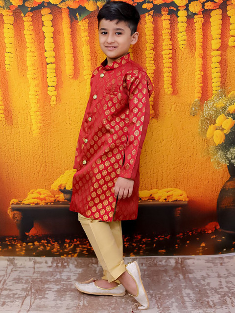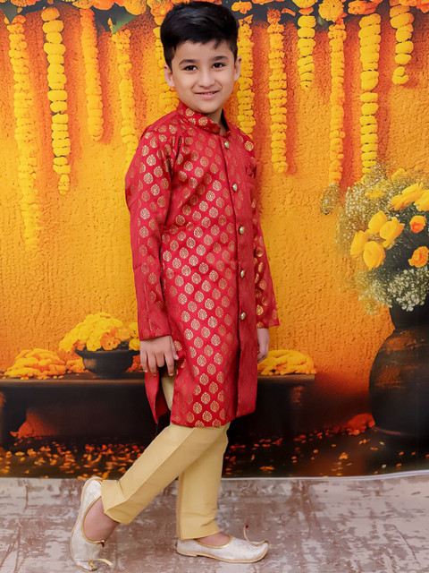 Green self design sherwani, has a mandarin collar, stylised wrap-over front with button closures, long sleeves, one welt pocket and multiple slits