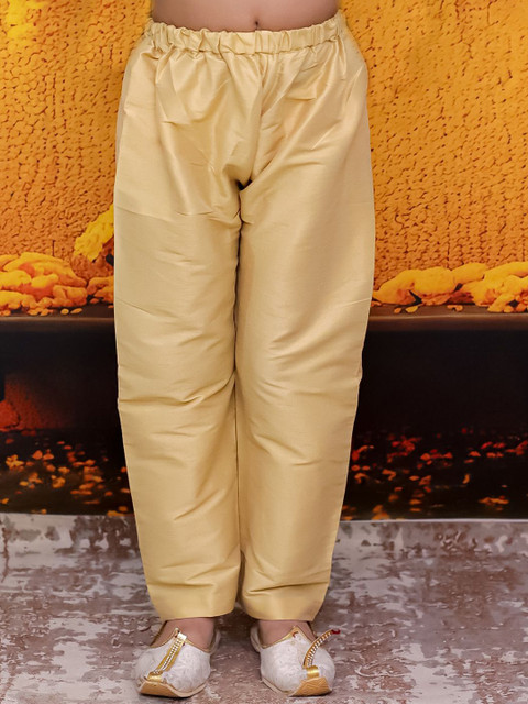 Gold solid trousers, has a partially elasticated waistband with belt loops, button closure, zip fly and two pockets