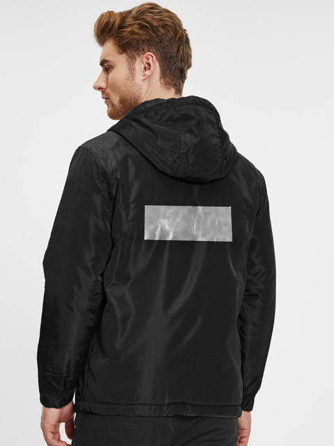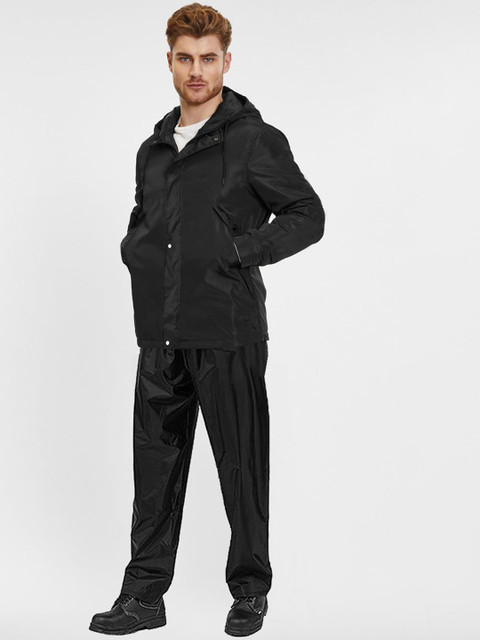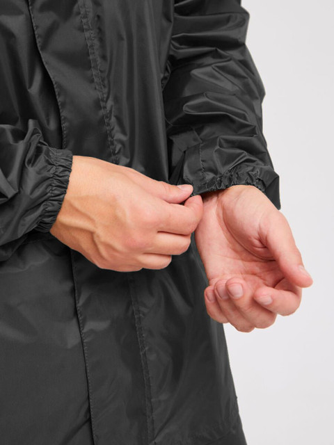 Black rain jacket Has an attached hood with drawstring at the hood with stopper High neck Long zipper with flap over for extra protection and one pocket.