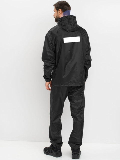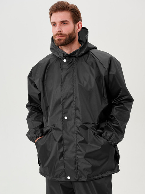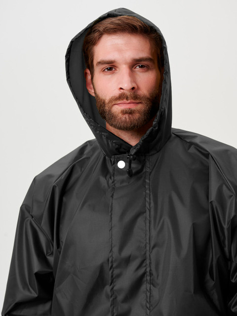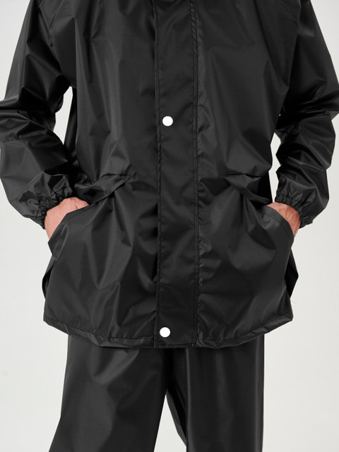 Black solid regular-fit hooded rain jacket, has an attached hood with drawcord toggle, seam-sealed with adjustable hems, a full front zipper placket with flap, cuffs and hood with drawcord, a packable hood and breathable vents at the back, and two flap zipper pockets