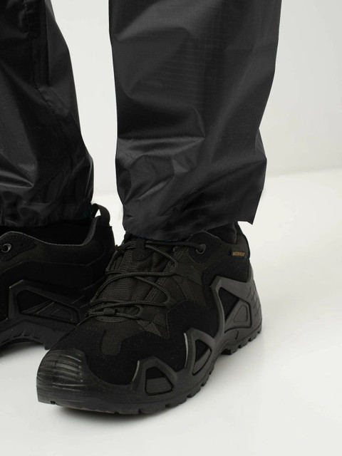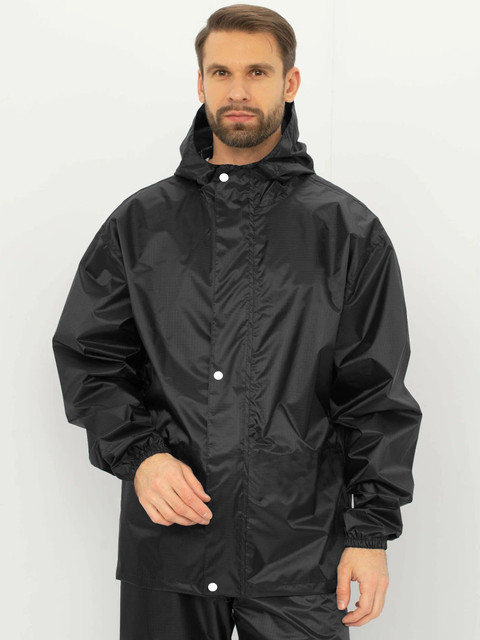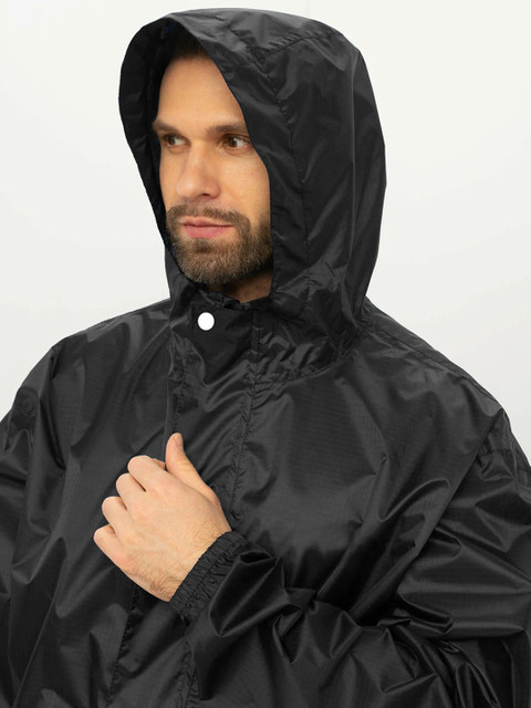 Black solid rain jacket, has a self-attached hood and cord lock stopper with the front closure using snap buttons and a placket covering the zipper closure and long sleeves