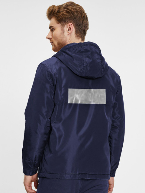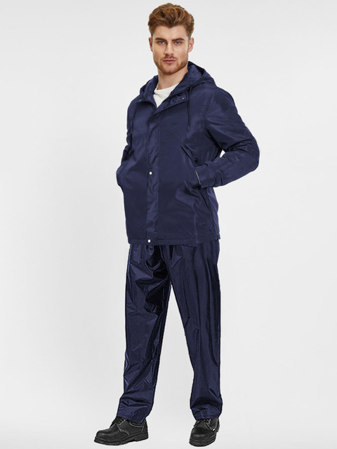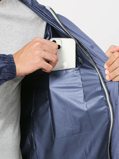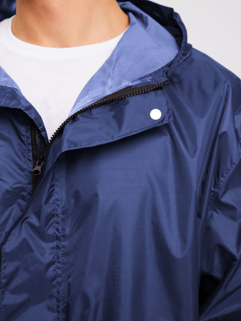 Blue solid rain jacket, has a self-attached hood that comes with a drawstring toggle and cord lock stopper with the front closure using snap buttons and a placket covering the zipper with velcro closure and long sleeves