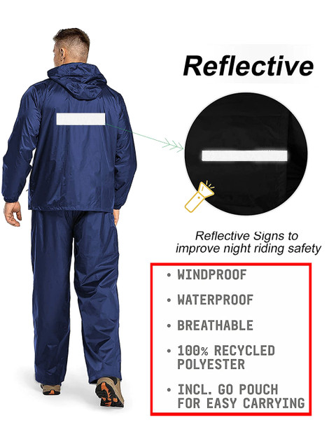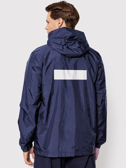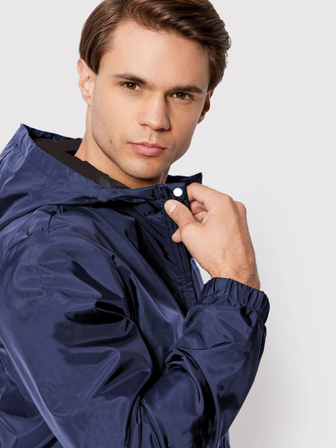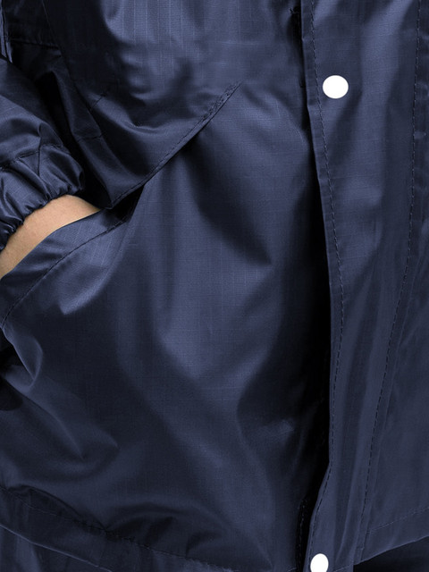 Blue solid rain jacket, has a self-attached hood that comes with a drawstring toggle and cord lock stopper with the front closure using snap buttons closure and long sleeves