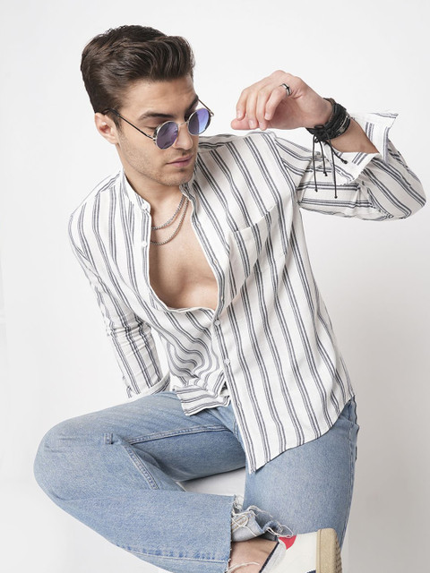 VASTRADO Men Classic Slim Fit Vertical Striped Band Collar Casual Shirt