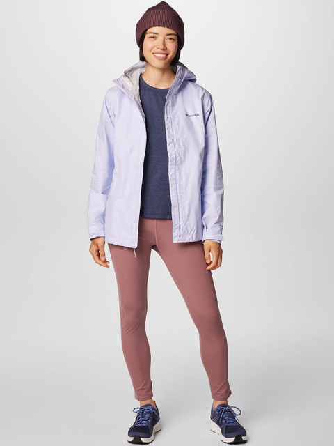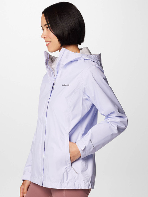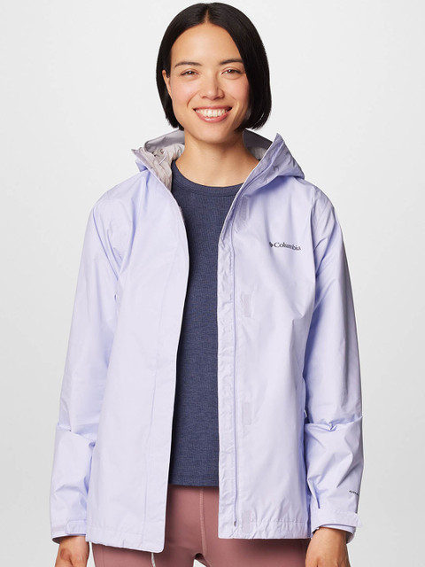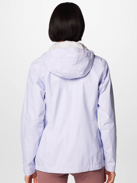White solid regular-fit hooded rain jacket, has an attached hood with drawcord toggle, seam-sealed with adjustable hems, a full front zipper placket with flap, cuffs and hood with drawcord, a packable hood and breathable vents at the back, and two flap zipper pockets