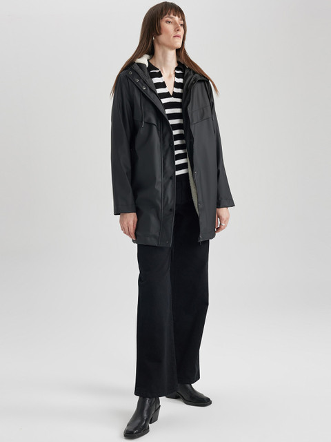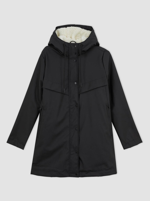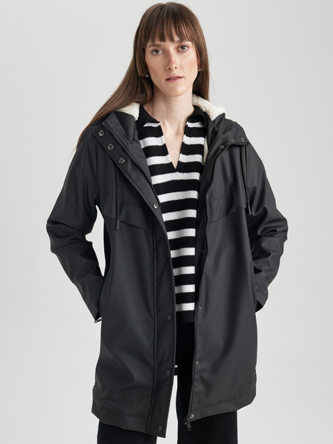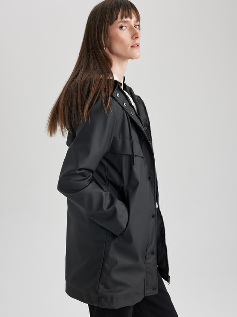 Black solid regular-fit hooded rain jacket, has an attached hood with drawcord toggle, seam-sealed with adjustable hems, a full front zipper placket with flap, cuffs and hood with drawcord, a packable hood and breathable vents at the back, and two flap zipper pockets