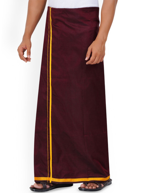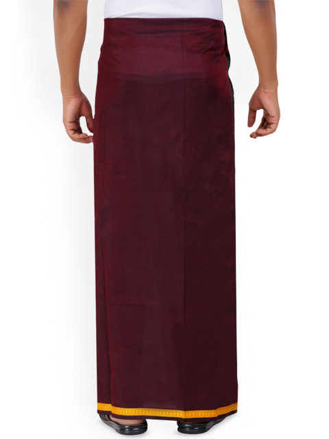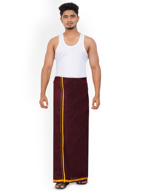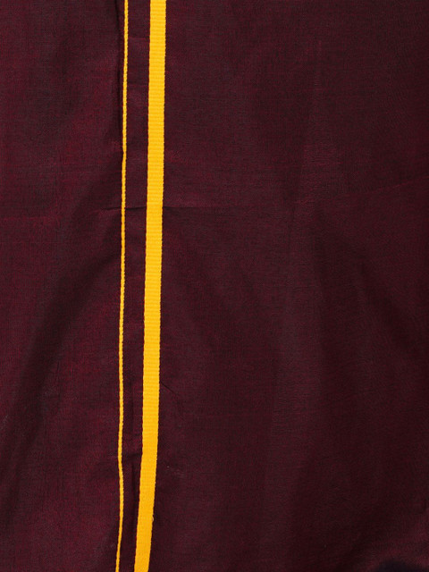 Ethazh Men’s Dark Maroon Cotton Blend Dhoti brings together tradition and sophistication. Made from a soft cotton blend, this 2-meter single-layer dhoti features a deep maroon color with a gold line and small checks design, complemented by a 1-inch border. Ideal for weddings, festivals, and cultural events, it provides a comfortable fit and timeless elegance. Easy to maintain, this dhoti retains its vibrant color and crisp design wash after wash.