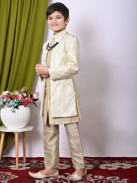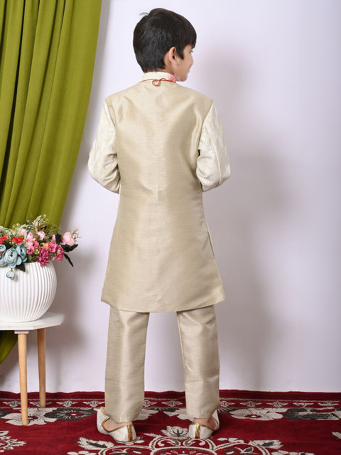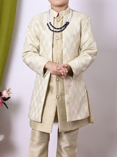 Gold toned printed sherwani, has a mandarin collar with button closures and long sleeves