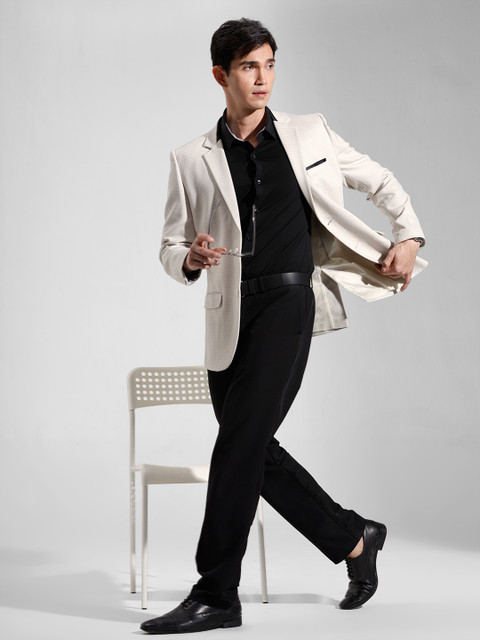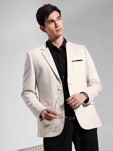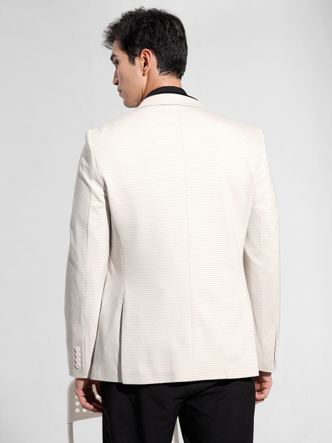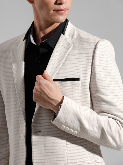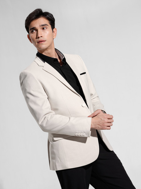 Beige printed single-breasted blazer, has a notched lapel collar, long sleeves, 5 pockets, double vented, straight hem